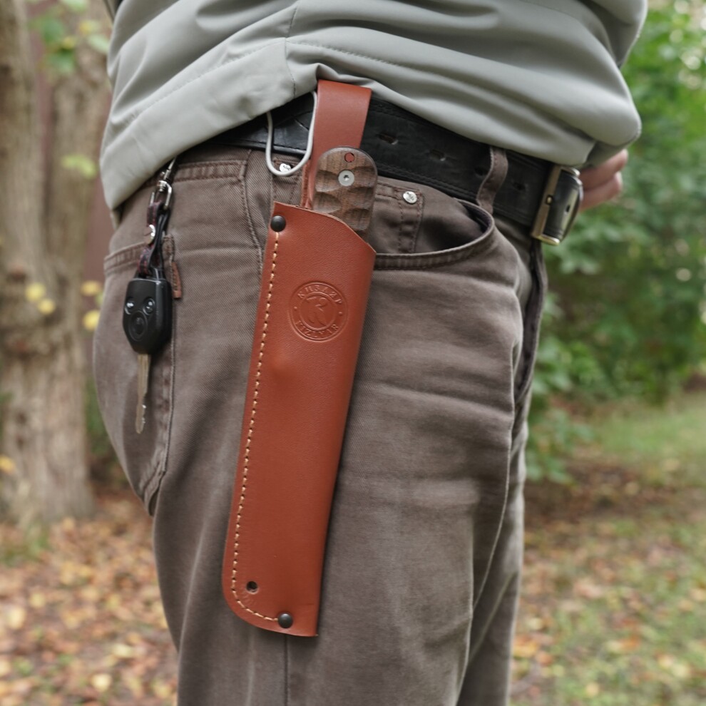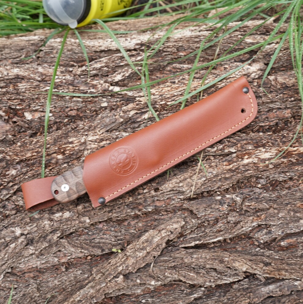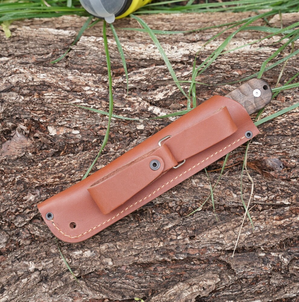 Нож Кефарта - получил свое имя от Хораса Кефарта (Гораций Кефарт, 1862–1931) — американского поэта, этнографа и исследователя дикой природы. Его считают одним из отцов современного бушкрафта. Кефарт много лет жил в Аппалачах и писал о жизни в горах, охоте и выживании. Для своих нужд он разработал универсальный полевой нож, который стал прообразом современных туристических и охотничьих моделей. Особенностью ножа Кефарта является простая, но очень функциональная форма. Без лишних изгибов, гарды или агрессивных элементов — нож удобен в разных хватах, и подходит для длительной работы, так же такая форма клинка сказывается на простоте и удобству заточки. Клинок длиной 123мм, толщина 2,6мм , общая длина ножа 244мм, сталь AUS-8. Рукоять так же как и клинок без лишних изгибов, овальная, с небольшим подпальцевым упором. Это позволяет легко менять хват и работать комфортно в разных направлениях. Материал микарта. Ножны из натуральной кожи, погружного типа имеют дватипа подвеса: жёсткий и свободный.