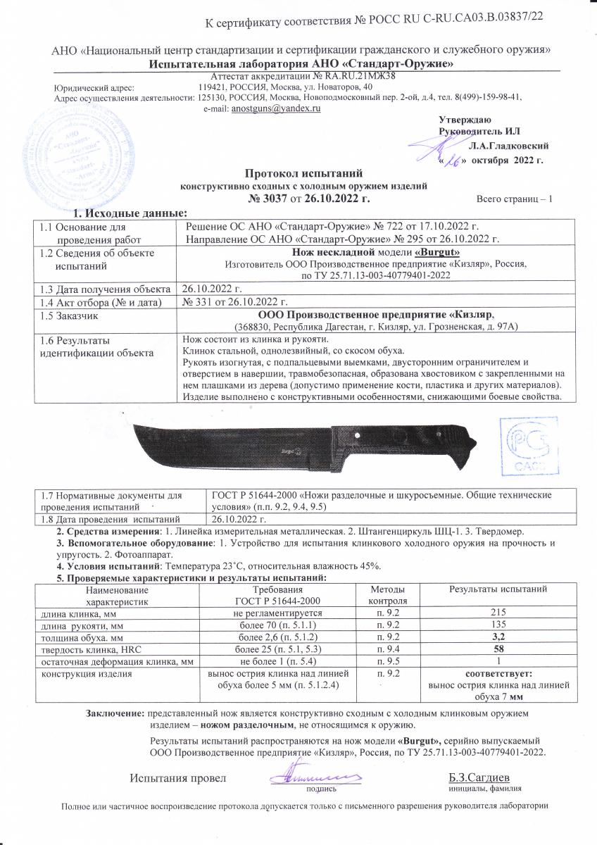 BURGUT (Бургут) Тактический пчак «Burgut» означает - беркут. Изначально нож производился по специальному заказу для сил специального назначения одной из среднеазиатских стран. Нож «Burgut» представляет собой собирательный образ всем известного азиатского ножа «Пчак», выполненного с применением современных технологий и материалов. Нож имеет цельную, жесткую конструкцию. Нож отлично сбалансирован, удобно сидит в руке, благодрая эргономичной рукояти. Нижняя кромка от ровного участка резко поднимается к кончику, что делает нож похожим на небольшое мачете. Высокие спуски обеспечивают точный и тонкий рез. Длинная режущая кромка позволяет делать глубокие и длинные разрезы. А длинный клинок сам по себе позволяет рубить ветки и кусты. Хвостовик клинка проходит рукоять насквозь и образует на конце ударный элемент-стеклобой с отверстием под темляк. Нож комплектуется удобными ножнами из натуральной кожи. При кажущихся больших размерах, нож имеет очень приемлемый вес – 330 гр. Благодаря сбалансированным характеристикам стали AUS-8, которая применяется для изготовления клинка, нож прекрасно подойдет для выполнения самых разных работ и задач.
