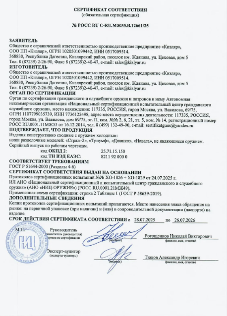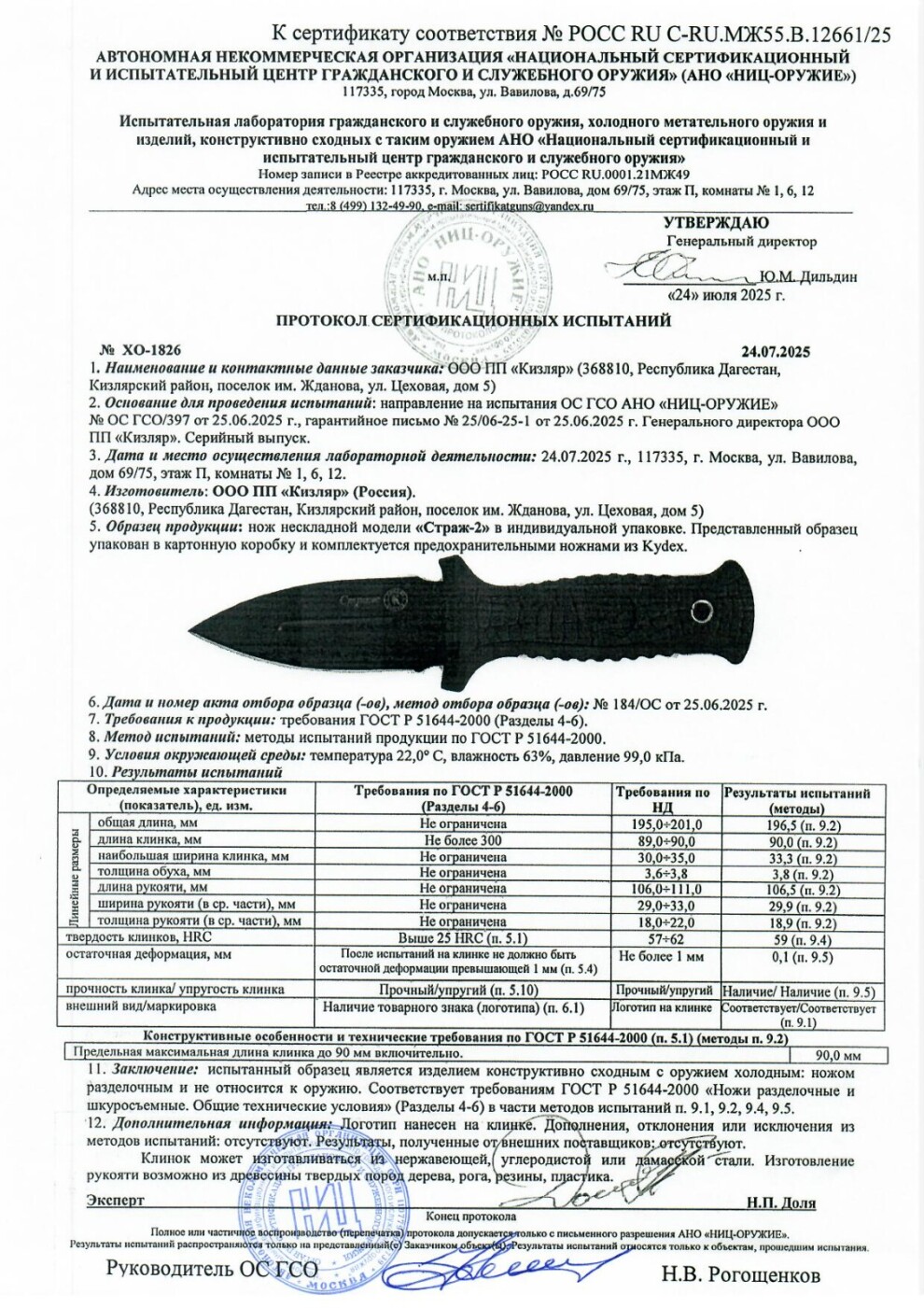 СТРАЖ-2 — это компактный городской фикс, кинжалообразного вида, оснащенный клинком из нержавеющей стали AUS-8 и рукоятью из Elastron G. По сравнению с первой моделью нож приобрел симметричную форму и клинка. Нож смонтирован по схеме Full-Tang. Клинок ножа имеет по центру дол по продольной оси, режущая кромка выполнена только с одной стороны лезвия. Страж-2 — красивый и функциональный фикс с харизматичным внешним видом, который можно использовать в городе в качестве ножа EDC или взять в поход, на пикник или иные загородные приключения.